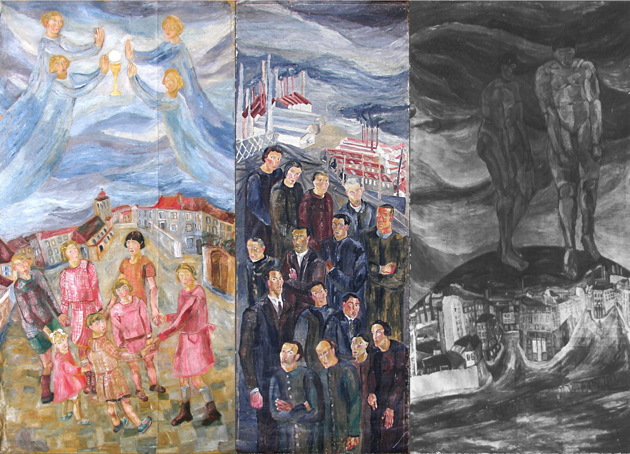 Le volet de gauche représente sur la place déserte d’un bourg ahurissant avec ses ruelles vides et ses maisons ivres, une ronde d’enfants : tous ces pauvres gosses tournent leurs visages pâlots, leurs regards où se lit l’angoisse, vers un même point d’où doit se lever on ne sait quelle obscure et terrible menace. Le panneau central met en scène dans des attitudes figées un groupe de jeunes hommes, tout de noir vêtus, qui songent lugubrement ou psalmodient sans doute quelque « Dies irae » dans un décor tragique de cheminée d’usines, sous un ciel noir et pesant comme un ciel de Jugement dernier. Enfin le volet de droite, plus énigmatique encore que les précédents, soumet à la perspicacité des visiteurs une petite ville noiraude, sans une âme par les rues rectilignes, où songent seules des maisons sagement alignées comme des joujoux de Nuremberg ; par contre, dressés debout et nus sur une colline inattendue, l’Homme et la femme dominent la ville de leur gigantesque et terrible nudité, comme au début du Monde…